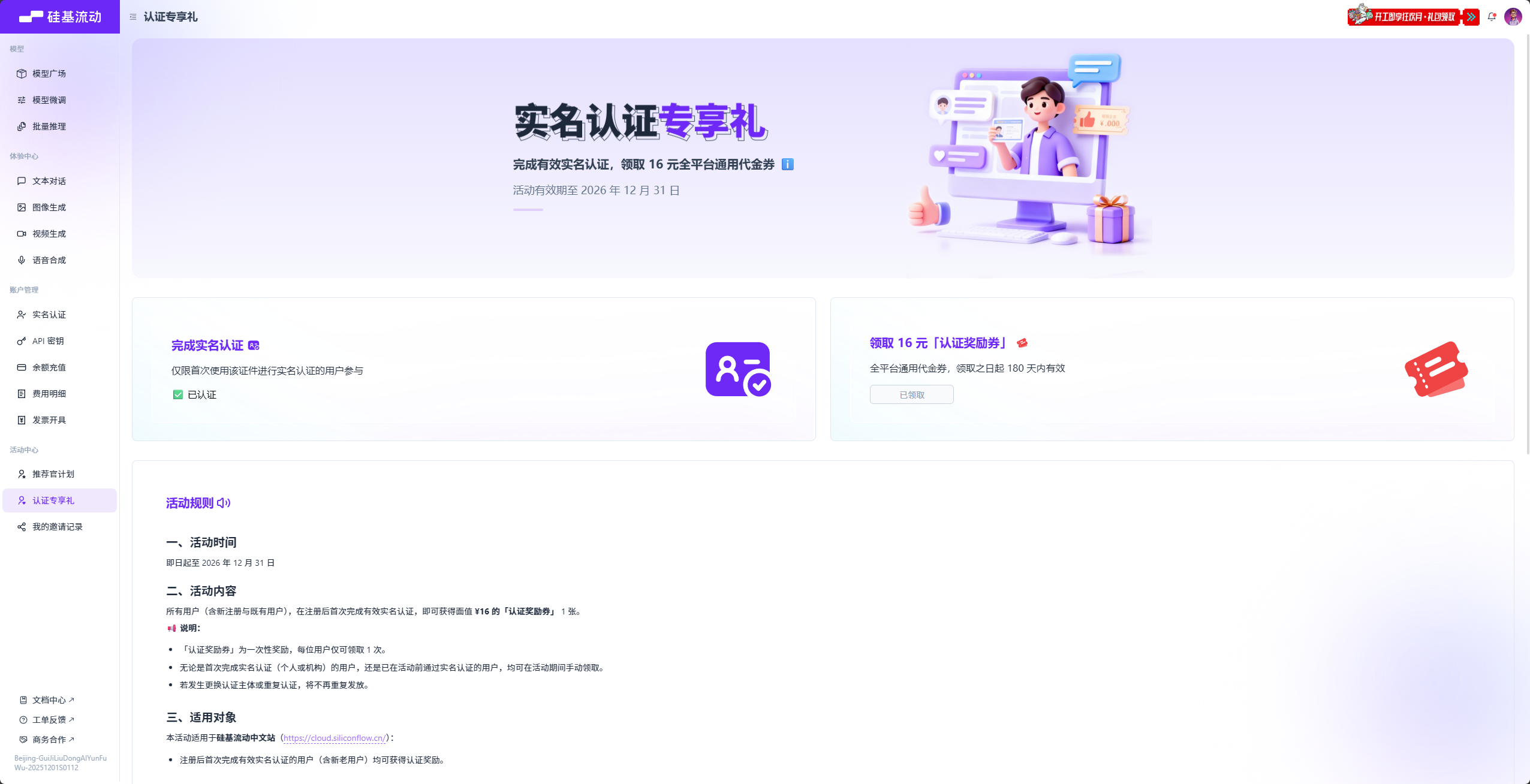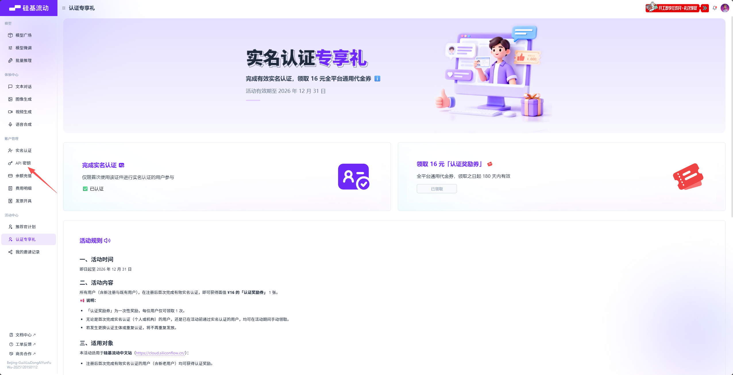 我这里使用硅基流动,新人实名后可以免费领取 16 元的优惠金额可以抵扣 token 费用