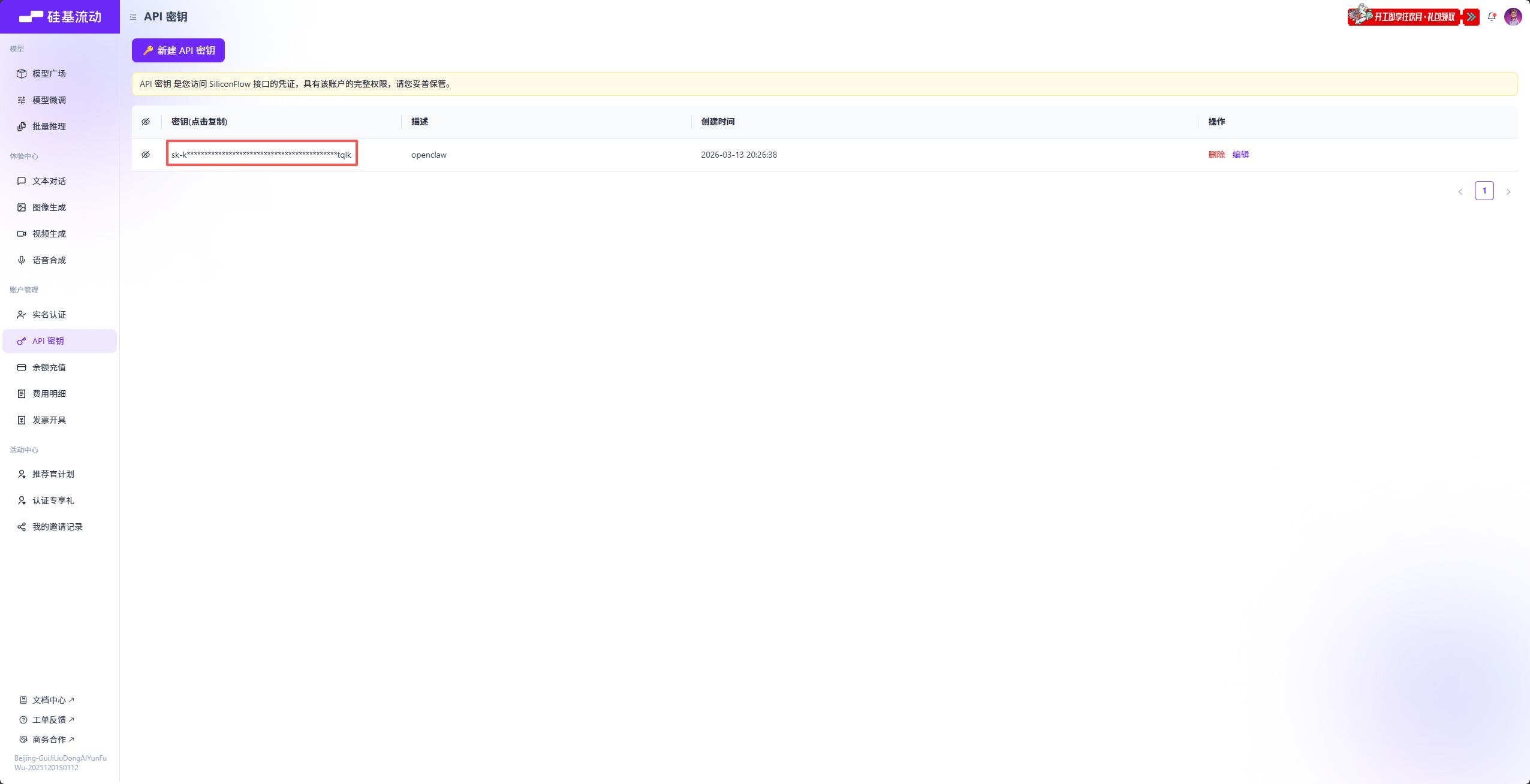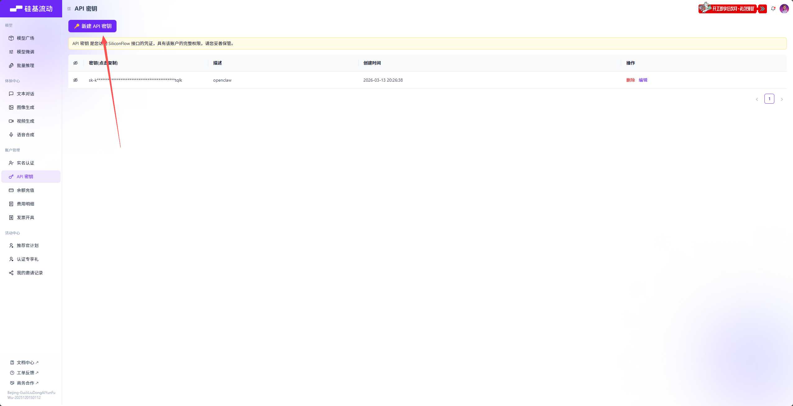 领取好后点击 api 密钥获取一个密钥,后面要用,切记密钥一定不要泄露